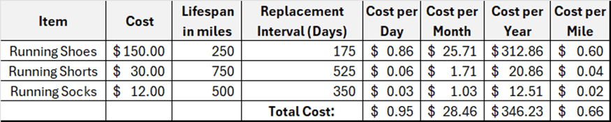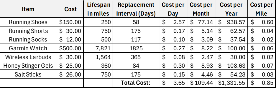 I will estimate an intermediate runner as 30 miles per week. Clothing costs are calculated as a function of miles, electronics as a function of time, and snacks and salt sticks are based on the existence of a long run in your training schedule.