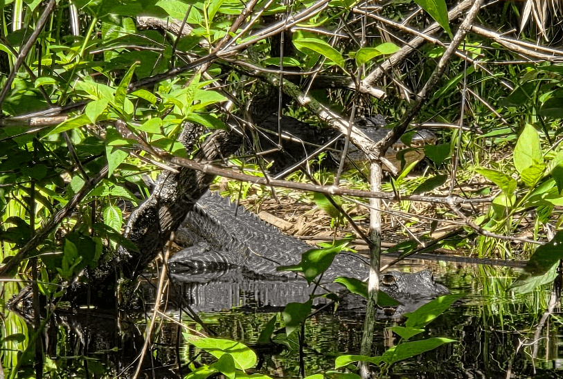 We did see an alligator tanning on the bank that was much larger than our kayaks. I would estimate that he weighed 300+ lbs, and I do not think he would have a problem eating either of us.
