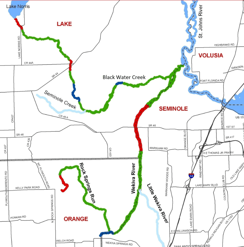 Green = Wild, Blue = Scenic, Red = Recreational section of river, Courtesy: wekivawildandscenicriversystem.com